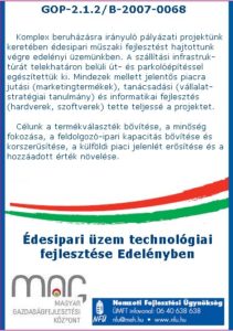 A Pannon Kraft Magyarország Kft. 18 éves fennállása óta kiemelt figyelmet fordít a gyártást támogató folyamatos fejlesztésekre, hiszen ezek biztosítják a cég hosszú távú fennmaradását, versenyképességét. Az elmúlt évek fejlesztési irányvonalához igazodva, a jelenlegi pályázat keretében egy olyan beruházást valósítottunk meg, amely hozzájárul a termékportfóliónk bővítéséhez, a partnereink megújuló igényeinek kielégítéséhez, valamint a termelési hatékonyság növeléséhez. A pályázat keretében egy édesipari mártó gépsor beszerzésére került sor, amely csokoládéval bevont, prémium kategóriás termékek előállítását teszi lehetővé. Az új gépsoron előállítható termékek kiegészítik az elmúlt években bevezetett csokoládéból készülő figurális termékeinket, s ezáltal szélesebb termékválasztékot tudunk a partnereink részére nyújtani az aktuális piaci trendeknek megfelelően. A gyártó részlegünk korábbi kialakítása nem volt alkalmas az új gépsor elhelyezésére, ezért a projekt keretében infrastrukturális beruházásra is sor került. Ennek keretében új klímatechnológia is beépítésre került, ami nagyban hozzájárul a kiváló minőségű termékek előállításához, a megfelelő munkakörülmények biztosításához, és a cég energia megtakarítási törekvéseihez. A projekt megvalósításával új munkahelyek jönnek létre, illetve a meglévő munkavállalók hosszú távú foglalkoztatása és szakmai fejlődése is biztosított. A projekt kezdetet: 2016.10.20. A projekt befejezése: 2017.05.31.